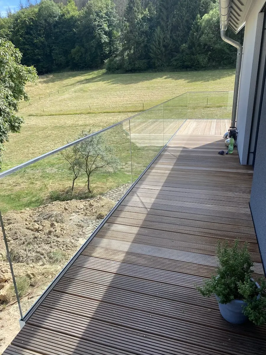 Wir verwenden ausschließlich Verbundsicherheitsglas (VSG) und rostfreien Edelstahl. Das Glas bleibt bei Bruch an der Folie haften, und die Edelstahl-Elemente sind witterungsbeständig sowie pflegeleicht.