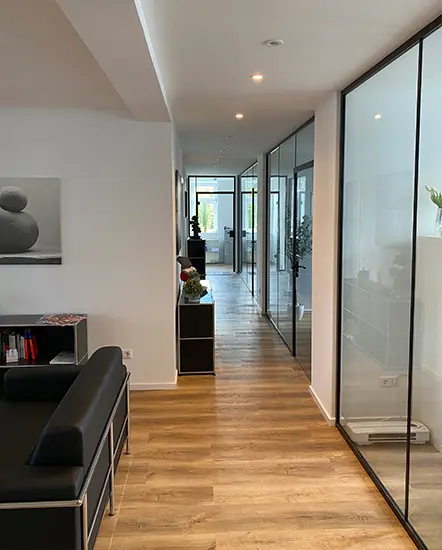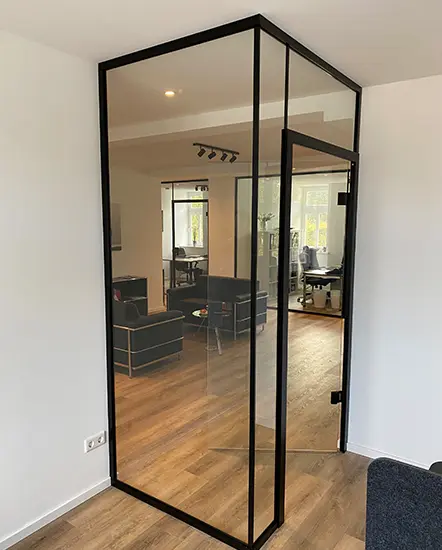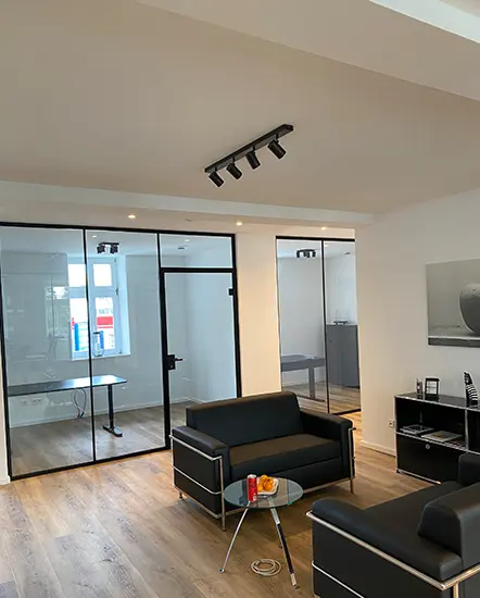 Unsere Glas-Trennwände ermöglichen Arbeitsbereiche, die offen wirken und dennoch klar strukturiert sind. Sie lassen viel Tageslicht in die Räume, schaffen eine wertige Optik und sorgen – trotz ihrer Transparenz – für die notwendige Ruhe, um konzentriert zu arbeiten. Die Montage erfolgt schnell und effizient, damit dein Betrieb ohne lange Unterbrechungen weiterlaufen kann.